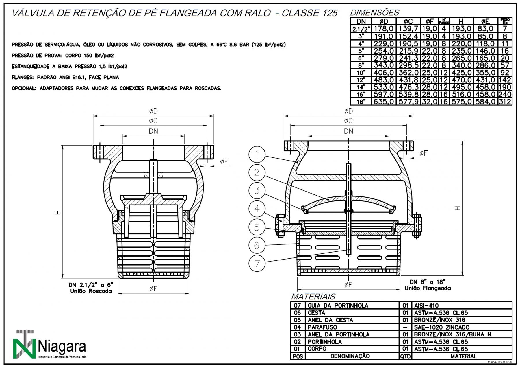 • De ferro fundido, com flanges, pelo padrão ANSI 125. Tipo reforçado, com fecho cónico e guias de bronze.