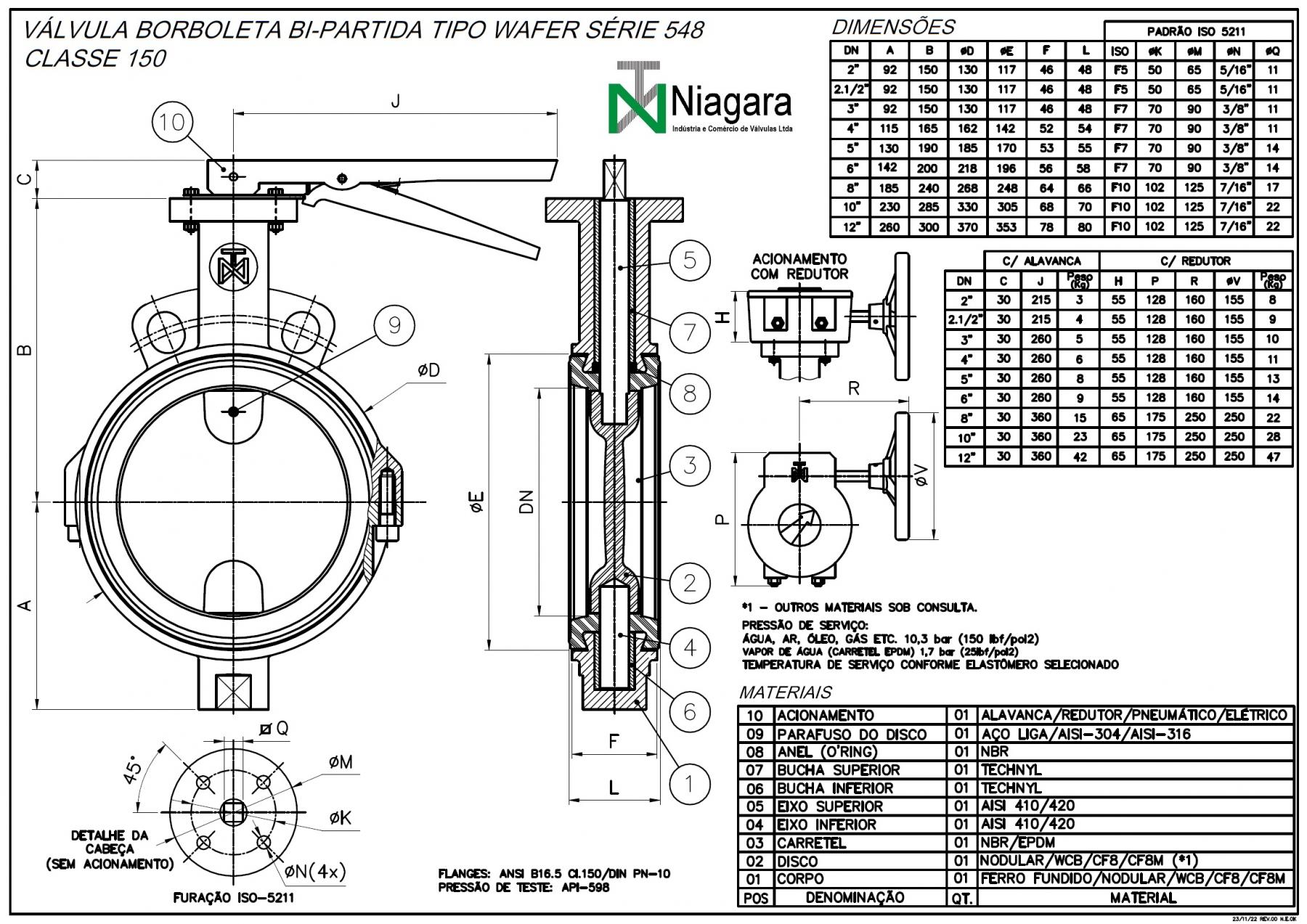 - Válvulas borboleta, tipo "Wafer", para montagem entre flanges ABNT-PB-15, ANSI-B16.5, classe 150 ou DIN-ND.10. Na falta de indicação, o fornecimento normal é para montagem entre flanges ANSI-B16.5, classe 150.