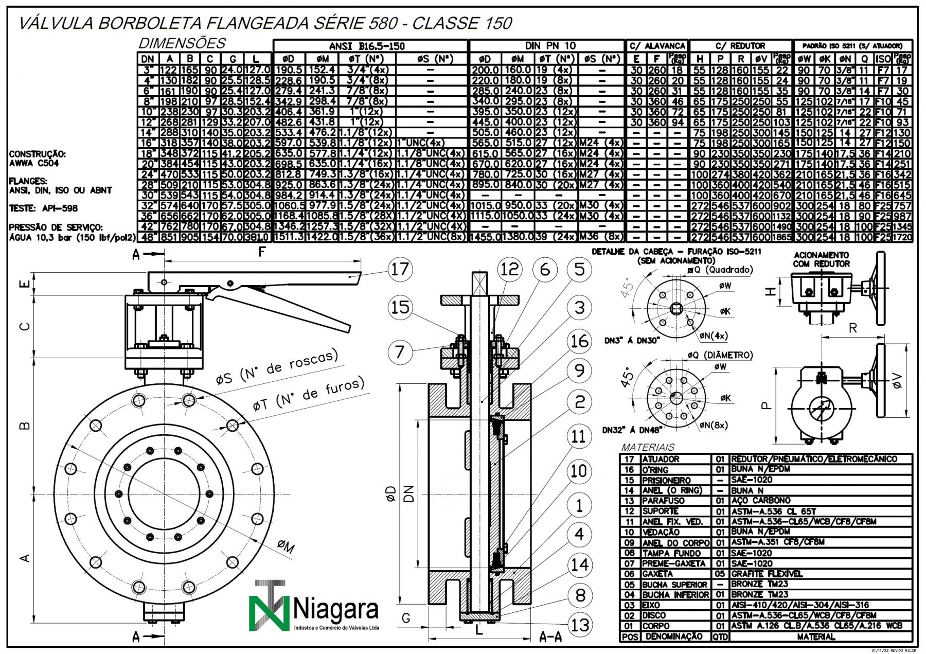 - Válvulas borboleta, corpo curto, conforme padrão AWWA-C.504, extremidades flangeladas pelo padrão ANSI-B16.1, classe 125.